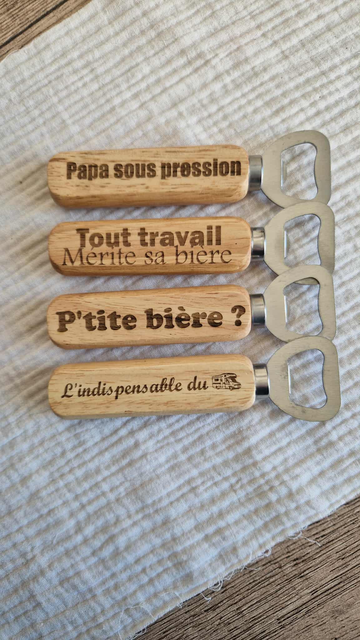 Modèles avec phrases prêtes à l’emploi. Pas d’inspiration ? Nous avons pensé à tout ! Découvrez nos décapsuleurs en bois gravés avec des phrases originales et amusantes. Parfait pour offrir sans se tromper, ils apportent une touche de bonne humeur à chaque apéritif.